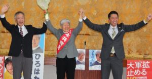高田由一前県議は、定数12に新人9人を含む15人の立候補が予想される大激戦の様相を報告し、ひろはた候補の必勝を訴えました。